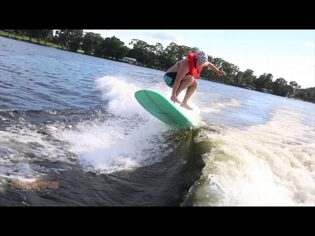 ボートサーフィンの引き波にロングボードでノーズライド。長くノーズライティングにトライ。