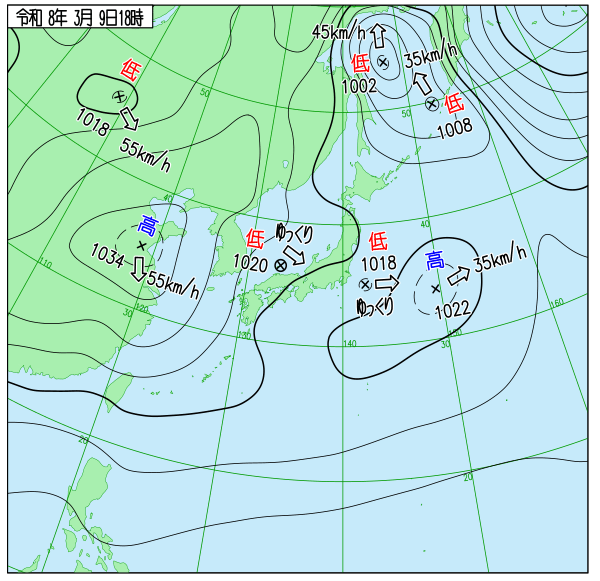 | 18 | 晴 | 6℃ | 59% | 0mm | 3.9m/s 北北東 |