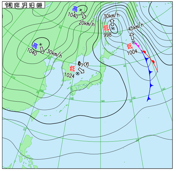 | 9 | 晴 | 4℃ | 63% | 0mm | 2.7m/s 北北東 |