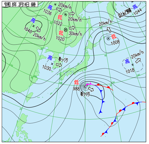| 9 | 曇 | 8℃ | 66% | 0mm | 2m/s 北北東 |